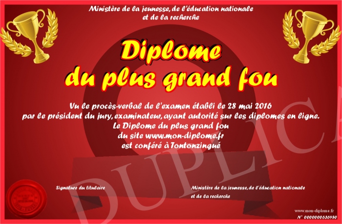 Envoyez par email votre Diplôme du plus grand fou personalisé