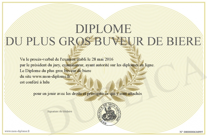 Envoyez par email votre Diplôme du plus gros buveur de biere personalisé