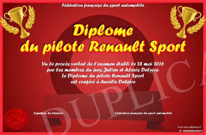 Envoyez par email votre Diplôme du pilote Renault Sport personalisé