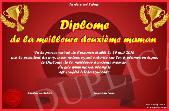 Envoyez par email votre Diplôme de la meilleure deuxième maman personalisé