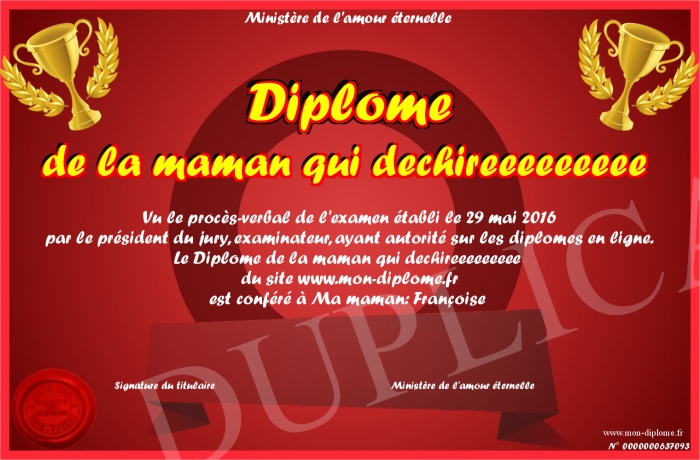Envoyez par email votre Diplôme de la maman qui dechireeeeeeeee personalisé
