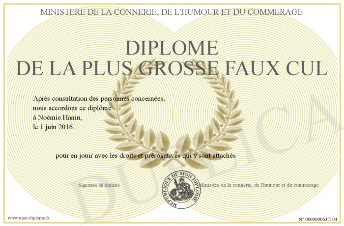 Envoyez par email votre Diplôme de la plus grosse faux cul personalisé