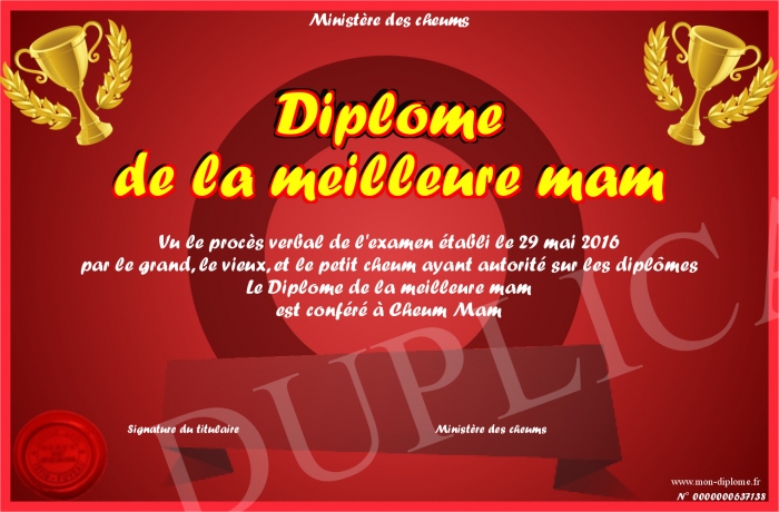 Envoyez par email votre Diplôme de la meilleure mam personalisé