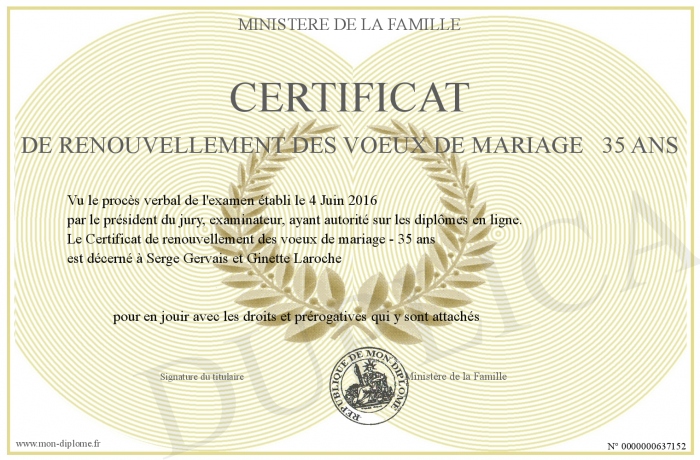 Envoyez par email votre Certificat de renouvellement des voeux de mariage 35 ans personalisé