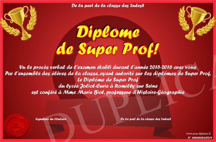 Envoyez par email votre Diplôme de Super Prof! personalisé