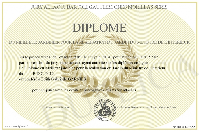 Envoyez par email votre Diplôme du Meilleur jardinier pour la réalisation du Jardin du Ministre de l'Intérieur personalisé