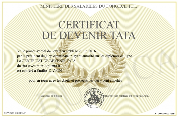 Envoyez par email votre CERTIFICAT DE DEVENIR TATA personalisé