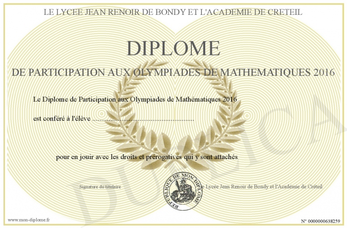 Envoyez par email votre Diplôme de Participation aux Olympiades de Mathématiques 2016 personalisé