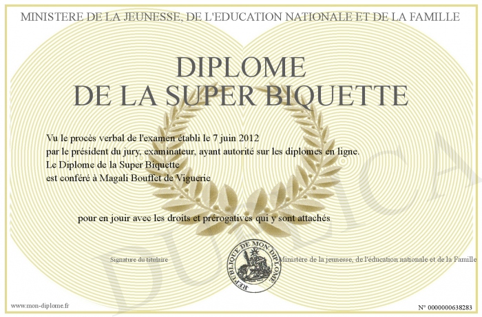 Envoyez par email votre Diplôme de la Super Biquette personalisé