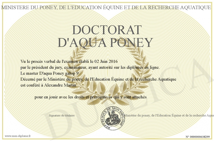 Envoyez par email votre Doctorat d'Aqua Poney personalisé