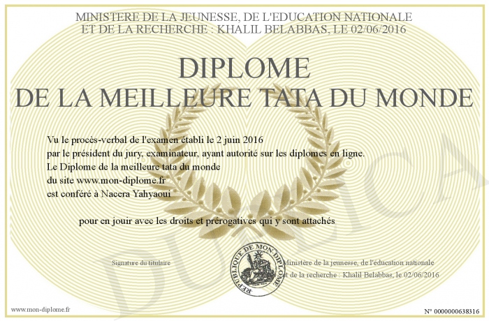 Envoyez par email votre Diplôme de la meilleure tata du monde personalisé