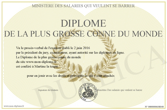 Envoyez par email votre Diplôme de la plus grosse conne du monde personalisé