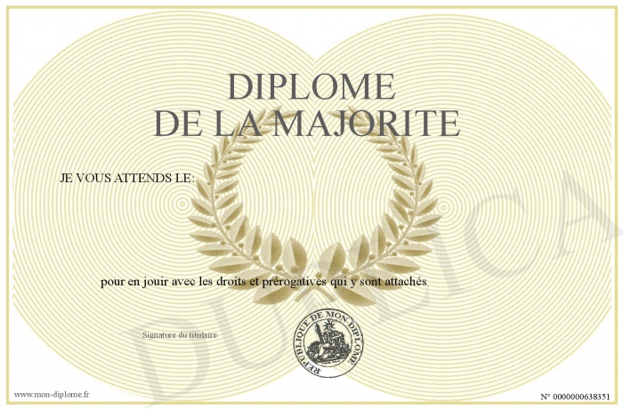 Envoyez par email votre Diplôme de la majorité personalisé