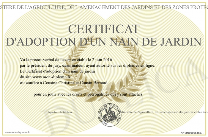Envoyez par email votre Certificat d'adoption d'un nain de jardin personalisé