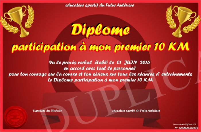 Envoyez par email votre Diplôme participation à mon premier 10 KM personalisé