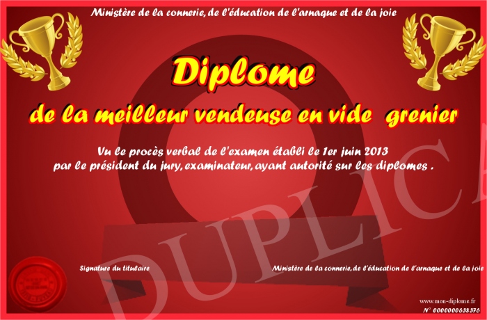 Envoyez par email votre Diplôme de la meilleur vendeuse en vide grenier personalisé