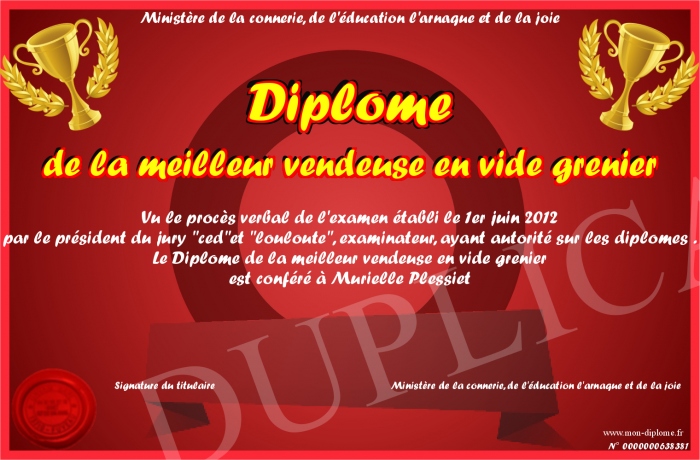 Envoyez par email votre Diplôme de la meilleur vendeuse en vide grenier personalisé