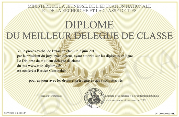 Envoyez par email votre Diplôme du meilleur délégué de classe personalisé