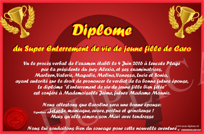 Envoyez par email votre Diplome du Super Enterrement de vie de jeune fille de Caro personalisé