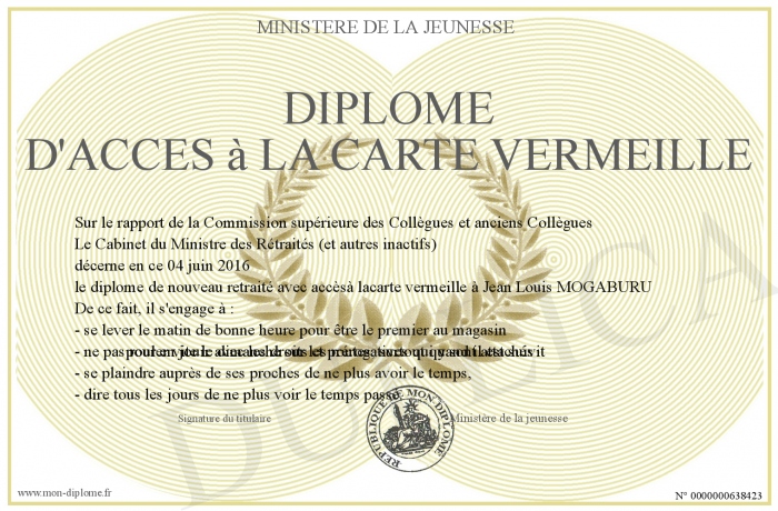 Envoyez par email votre Diplôme d'accès à la carte vermeille personalisé
