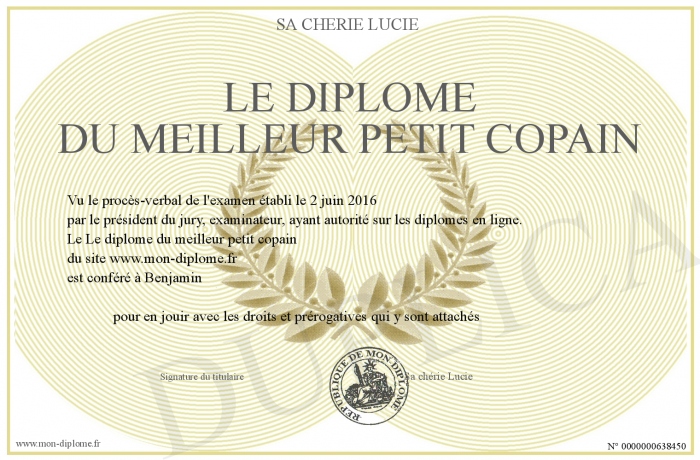 Envoyez par email votre Le diplôme du meilleur petit copain personalisé