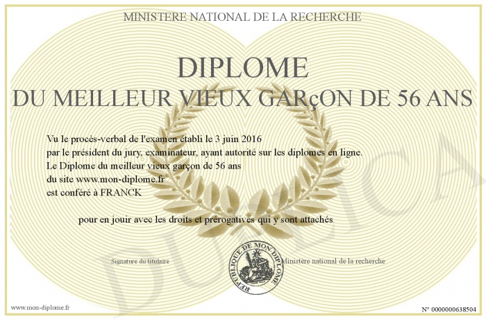 Envoyez par email votre Diplôme du meilleur vieux garçon de 56 ans personalisé