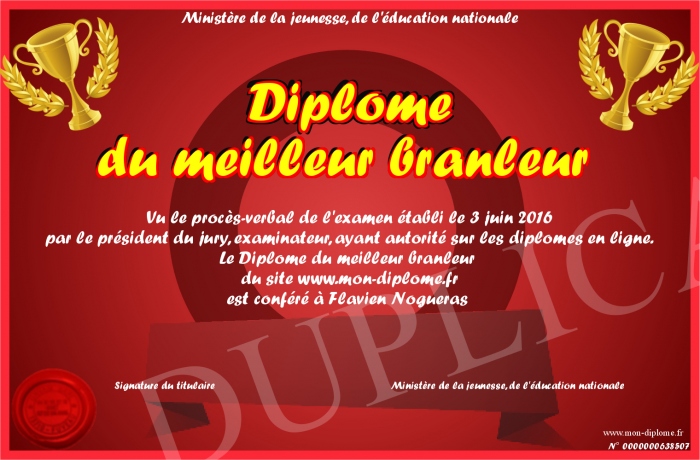 Envoyez par email votre Diplôme du meilleur branleur personalisé