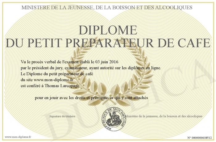 Envoyez par email votre Diplôme du petit préparateur de café personalisé