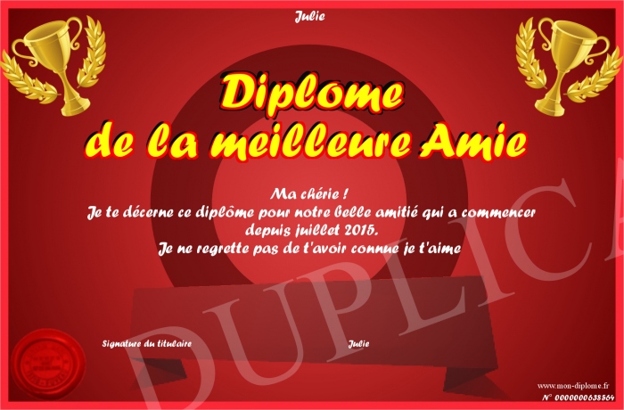 Envoyez par email votre Diplôme de la meilleure Amie personalisé