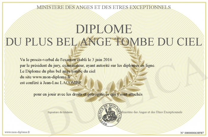 Envoyez par email votre Diplôme du plus bel ange tombe du ciel personalisé