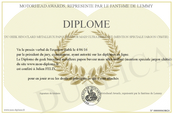 Envoyez par email votre Diplôme du geek binoclard métalleux papou buveur mais ultra brillant (mention spéciale jargon châtié) personalisé