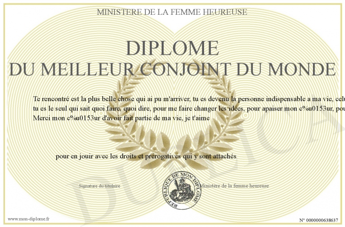 Envoyez par email votre Diplôme du meilleur conjoint du monde personalisé