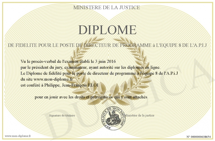 Envoyez par email votre Diplôme de fidélité pour le poste de directeur de programme à l'équipe 8 de l'A.P.i.J personalisé