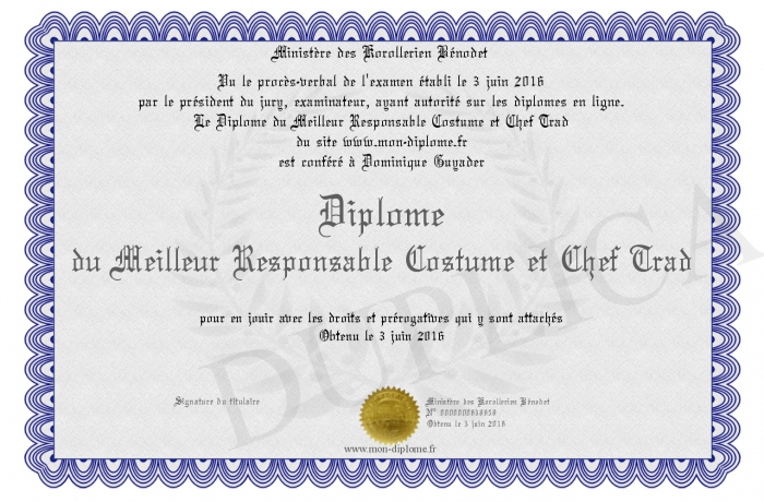Envoyez par email votre Diplôme du Meilleur Responsable Costume et Chef Trad personalisé