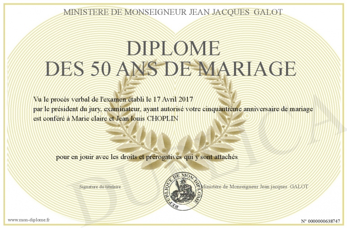 Envoyez par email votre Diplôme des 50 ans de mariage personalisé