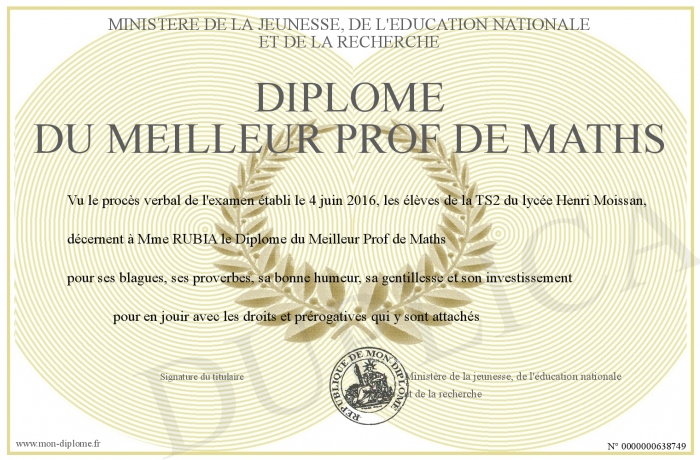 Envoyez par email votre Diplôme du Meilleur Prof de Maths personalisé