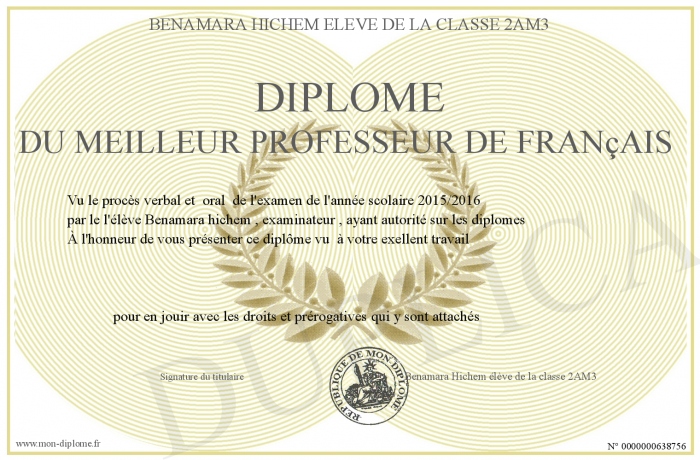 Envoyez par email votre Diplôme du meilleur professeur de français personalisé
