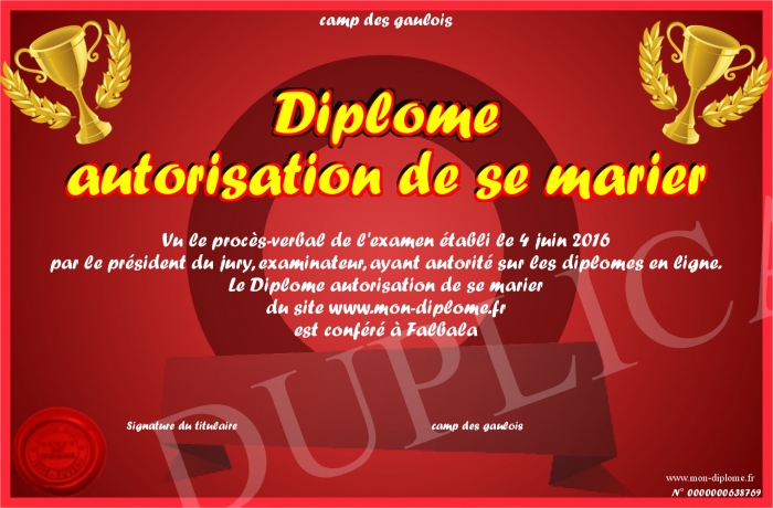 Envoyez par email votre Diplôme autorisation de se marier personalisé