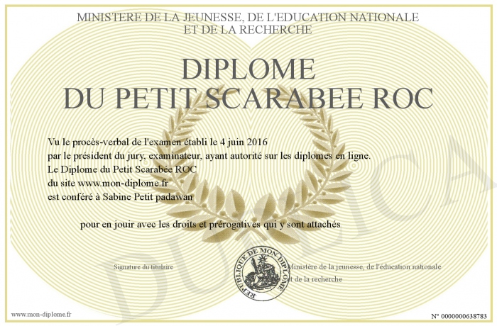 Envoyez par email votre Diplôme du Petit Scarabée ROC personalisé