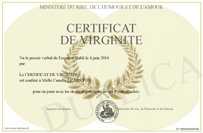 Envoyez par email votre CERTIFICAT DE VIRGINITE personalisé