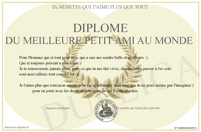 Envoyez par email votre Diplôme du meilleure petit ami au monde personalisé