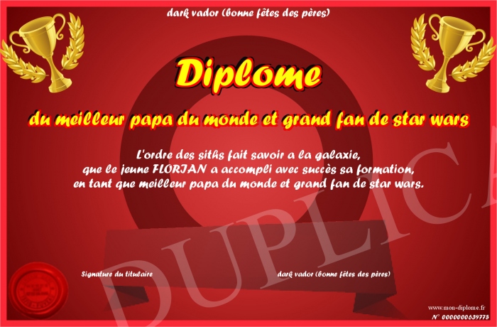 Envoyez par email votre Diplôme du meilleur papa du monde et grand fan de star wars personalisé