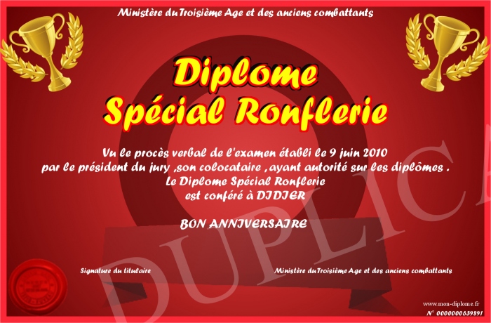 Envoyez par email votre Diplôme Spécial Ronflerie personalisé