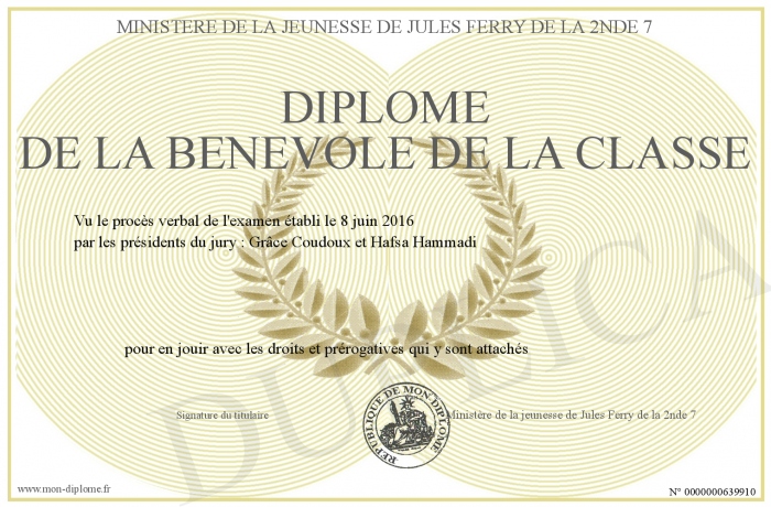 Envoyez par email votre Diplôme de la bénévole de la classe personalisé