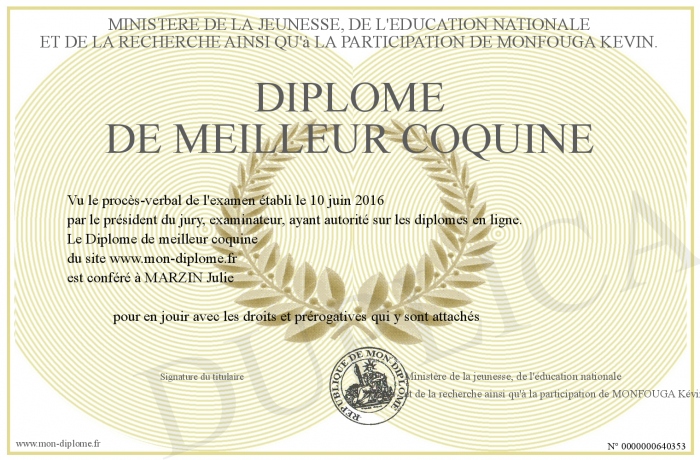 Envoyez par email votre Diplôme de meilleur coquine personalisé