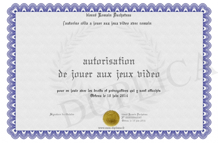 Envoyez par email votre autorisation de jouer aux jeux video personalisé