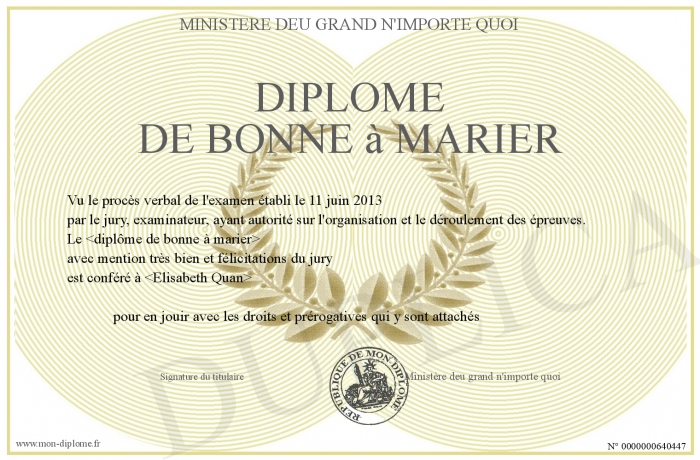 Envoyez par email votre Diplôme de bonne à marier personalisé