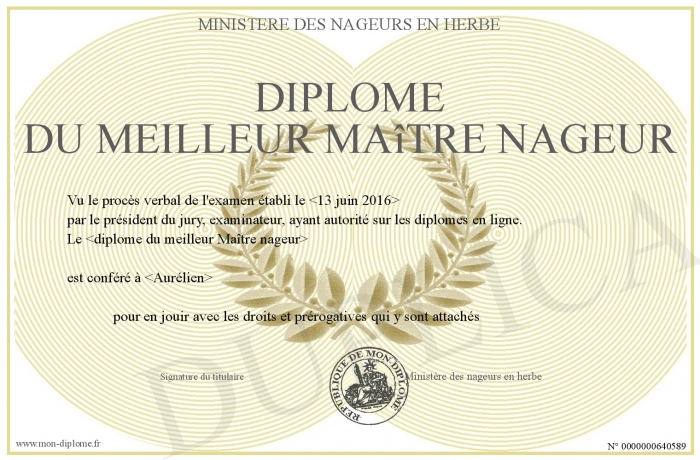 Envoyez par email votre Diplome du meilleur Maître Nageur personalisé