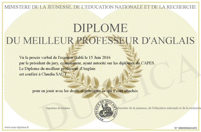Envoyez par email votre Diplôme du meilleur professeur d'Anglais personalisé