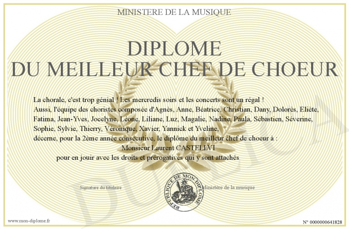 Envoyez par email votre diplôme du meilleur chef de choeur personalisé